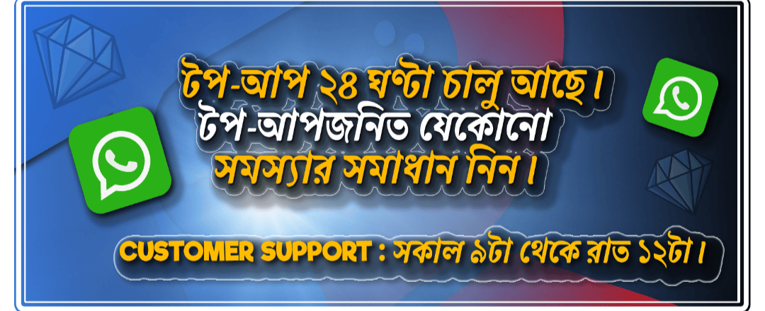 Notice: আমাদের ওয়েবসাইটে রয়েছে দিনরাত 24 ঘন্টা অটো টপ-আপ সার্ভিস যে কোন সমস্যায় আমাদের সাথে যোগাযোগ করুন +8801866239827